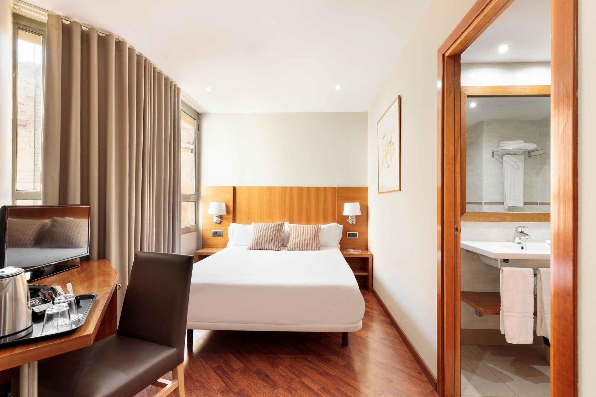 Deze eenpersoonskamer van 15 m² biedt een comfortabele ruimte met een eenpersoonsbed, dat zeer gewaardeerd wordt om zijn comfort. Geniet van het uitzicht naar buiten of naar binnen, het natuurlijke licht en een eigen badkamer met een douche, een haardroger en handdoeken. De kamer is voorzien van een parketvloer, geluidsisolatie, een flatscreen-tv met satellietzenders, een bureau, een kledingkast en een telefoon. Bovendien is er een lift aanwezig en is het een rookvrije ruimte.