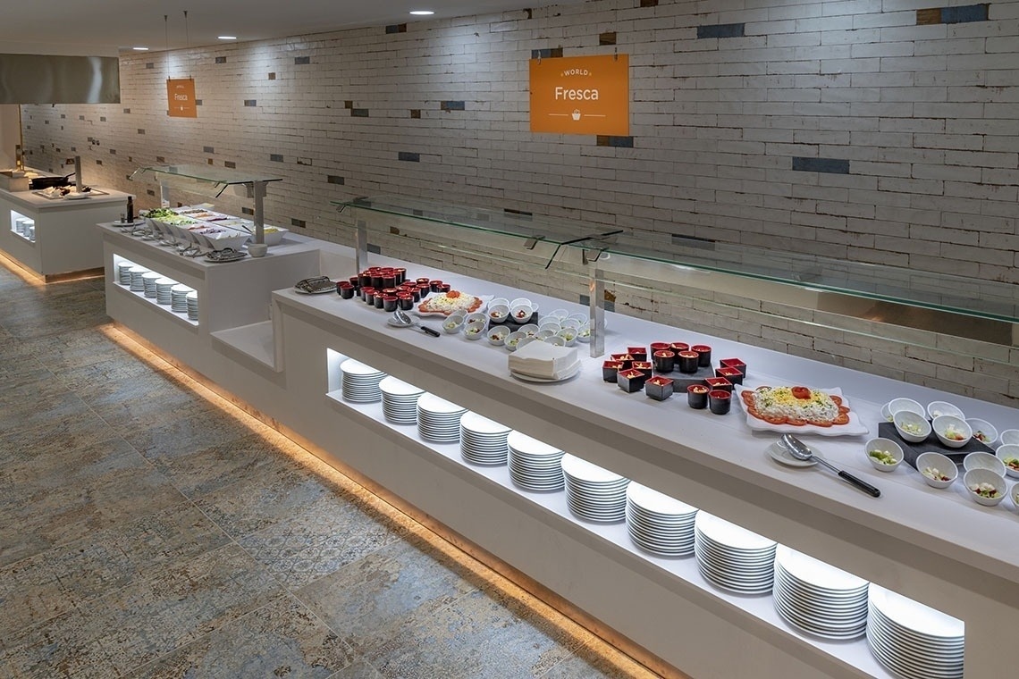 Ons buffet biedt traditionele mediterrane gerechten en internationale specialiteiten. We organiseren twee themadiners per week: Mexicaans en Aziatisch. Tijdens de lunch en het diner kunt u genieten van showcooking. Openingstijden: Ontbijt 8:00 - 10:00 · Lunch 13:00 - 14:30 · Diner 19:00 - 21:30