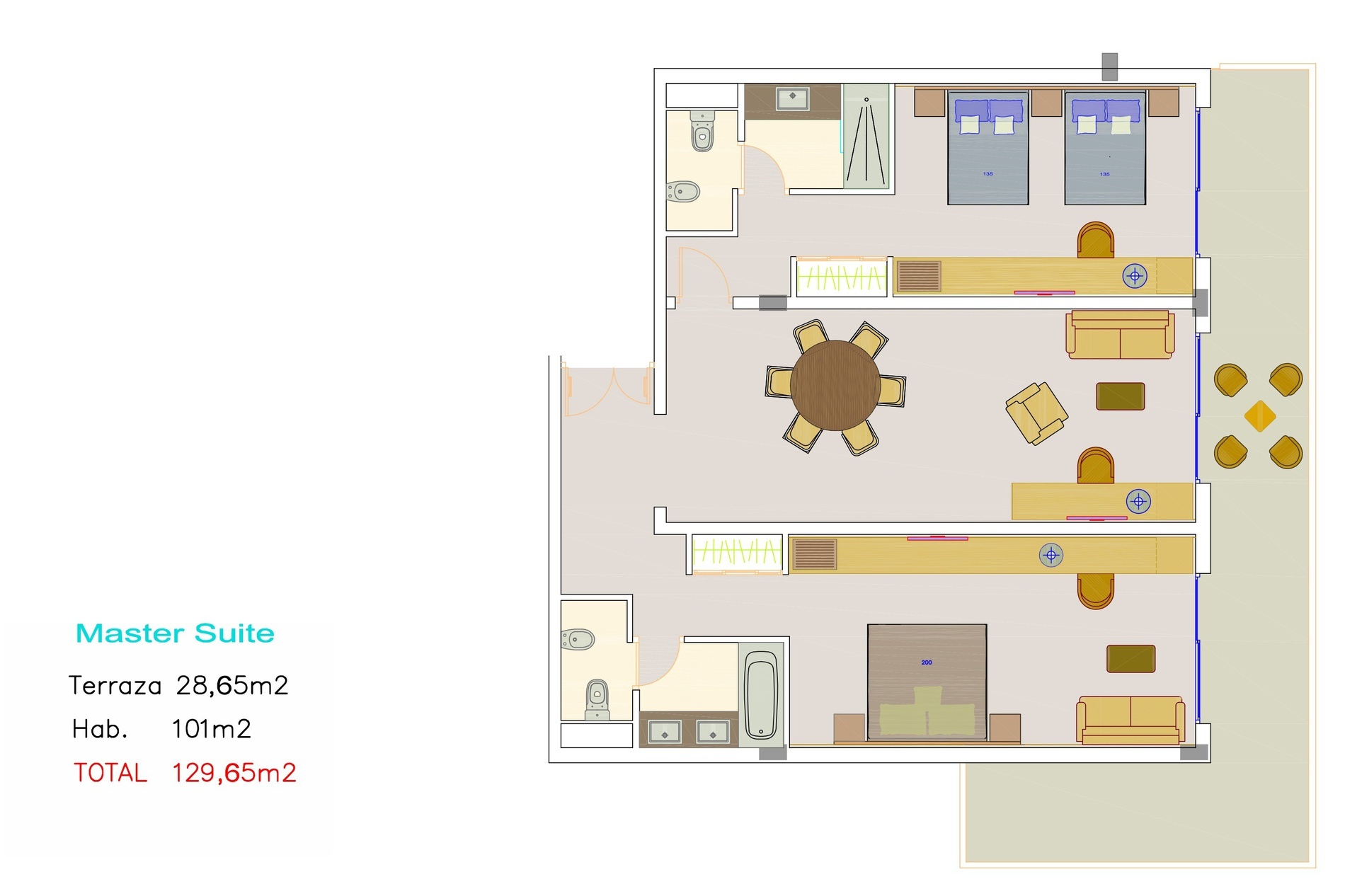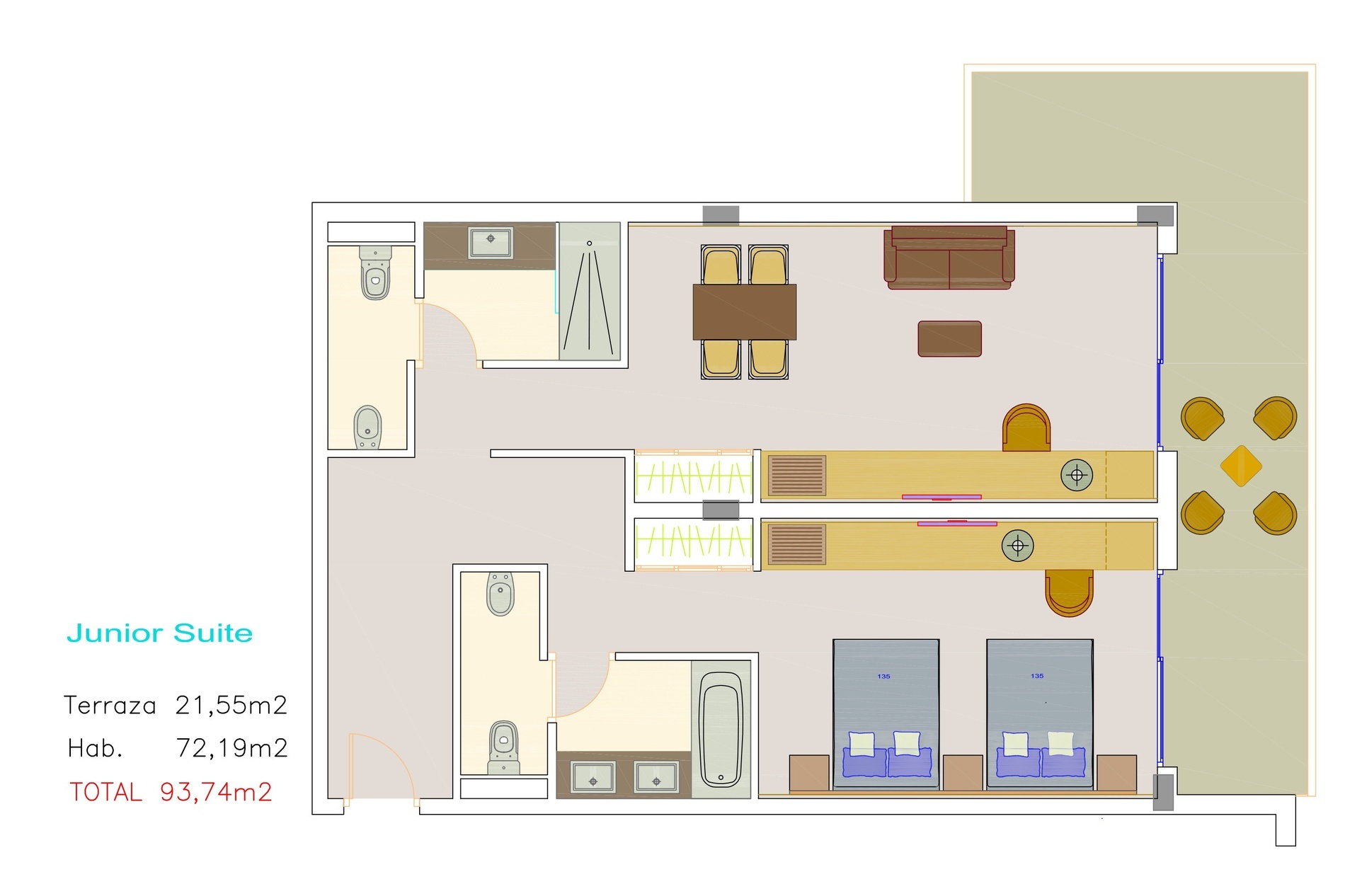 Номера с возможностью размещения до восьми человек (6 взрослых + 2 детей). Они состоят из двух кроватей размером 1,35 м x 2,00 м + двух диванов-кроватей шириной 1,40 м + одной кровати размером 2,00 м x 2,00 м (установка дополнительных кроватей не допускается).